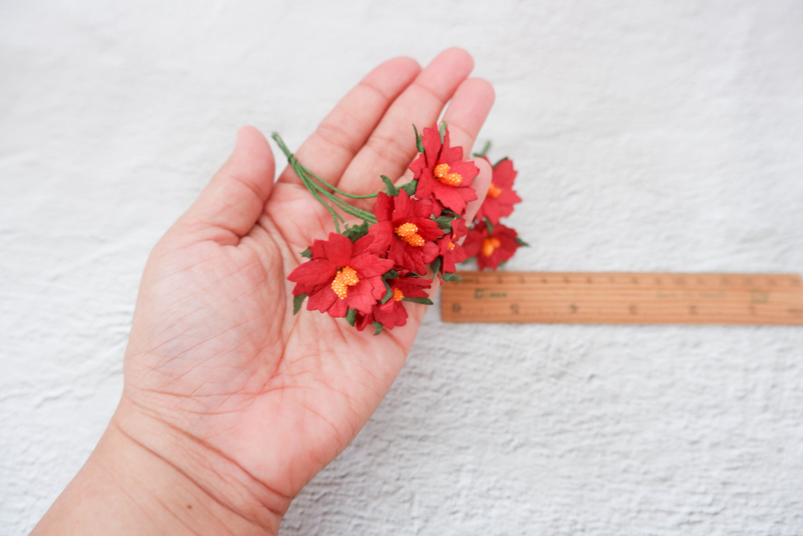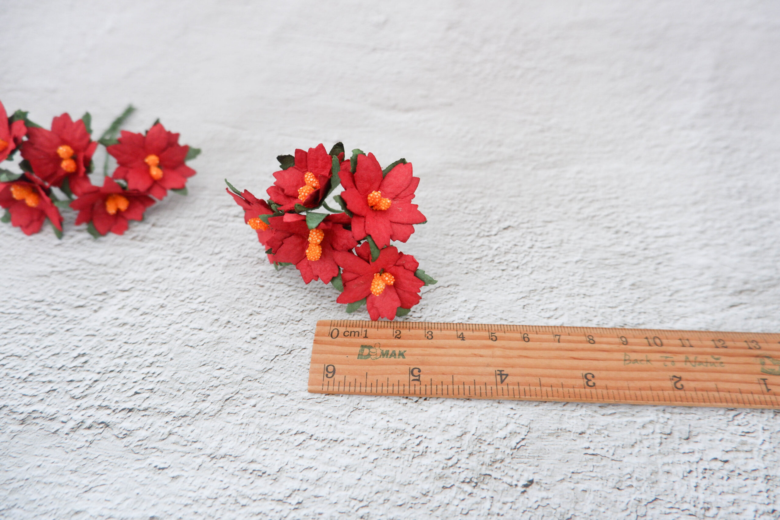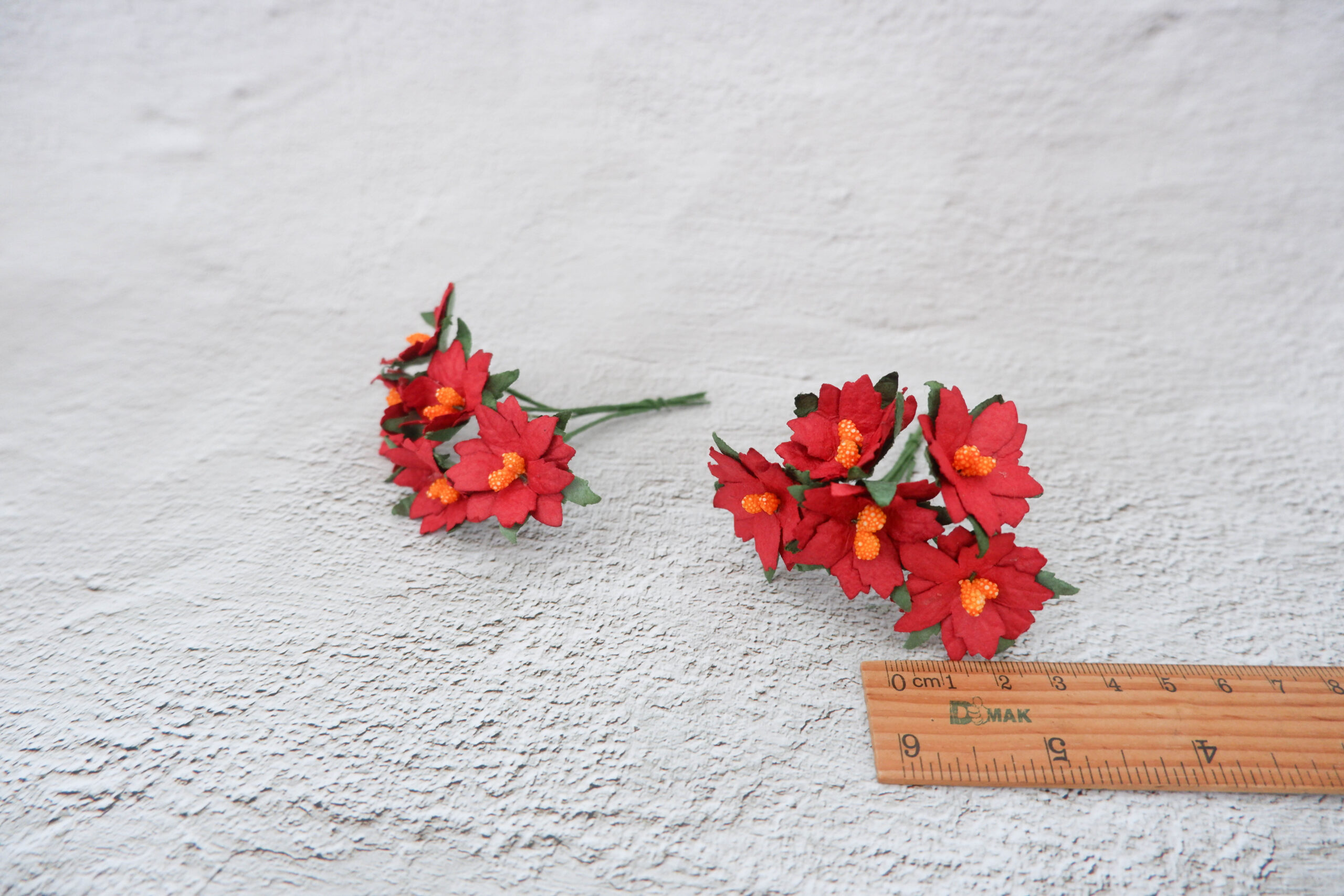 These 3 cm paper poinsettias are made from mulberry paper come with wire stem.