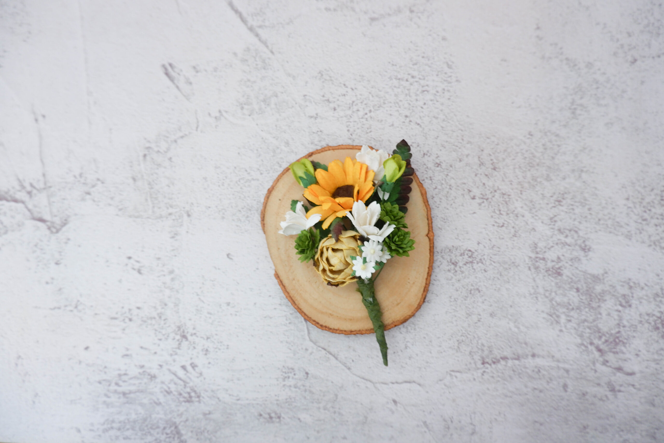 This set of corsage features a cluster of warm sunflowers, complemented by verdant greenery and delicate white flowers. It will be perfect for wedding, prom, or any special events.